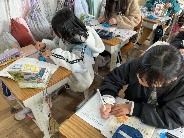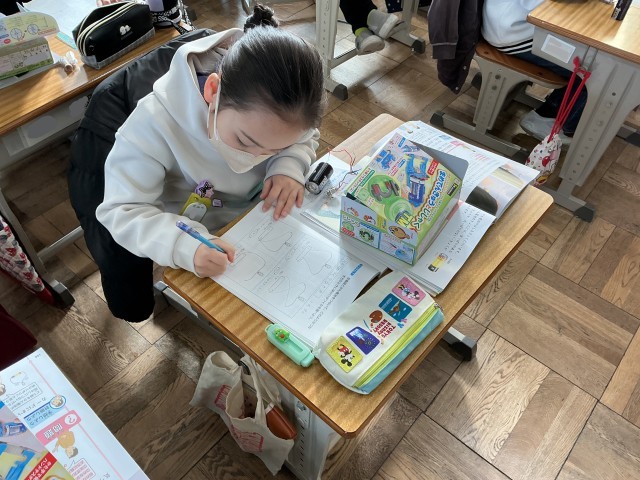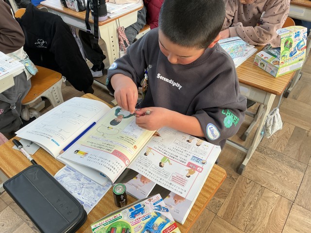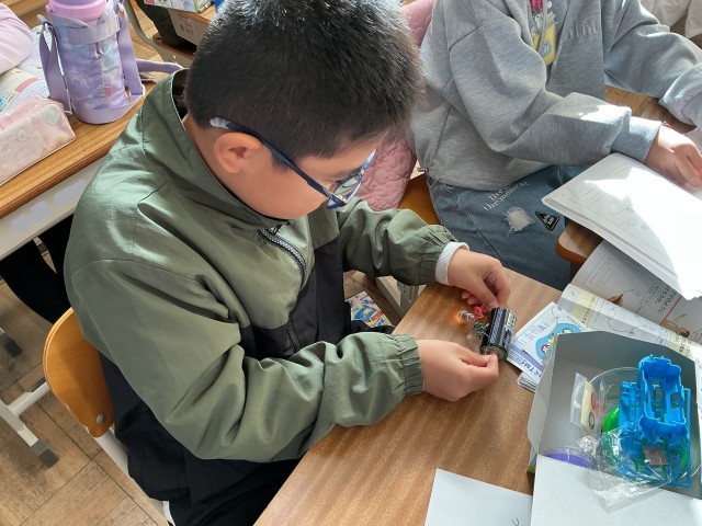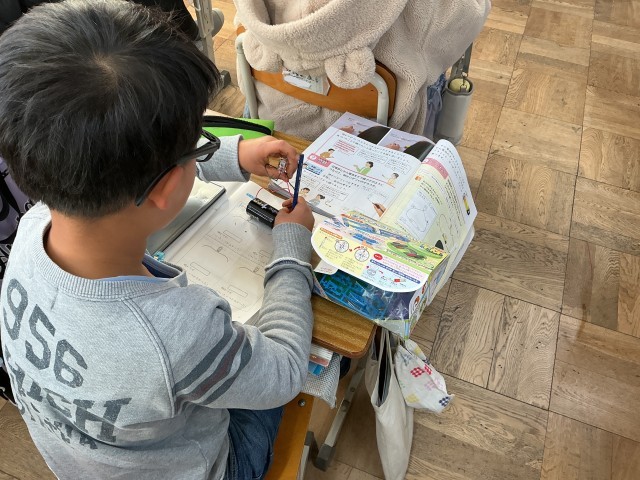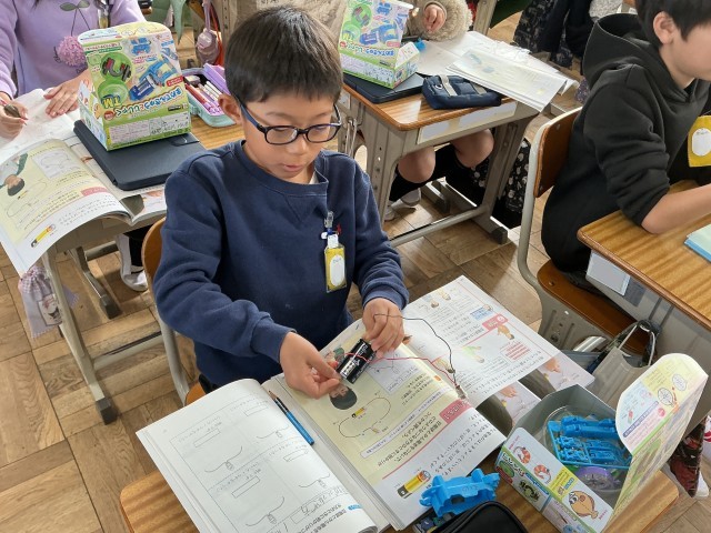 3年生の理科の授業で、「電気の通り道」について学習しました。実験キットの豆電球や導線、電池を使い、豆電球に明かりをつける実験を行いました。子どもたちは、導線のつなぎ方を工夫しながら、「このつなぎ方だとどうなるだろう」と予想を立て、さまざまな方法を試していました。明かりがついたときには、驚きや喜びの声があがり、友だち同士で結果を確かめ合う姿も見られました。実験を通して、電気が流れるためには正しい通り道が必要であることを理解し、電気の仕組みへの関心を高めることができました。