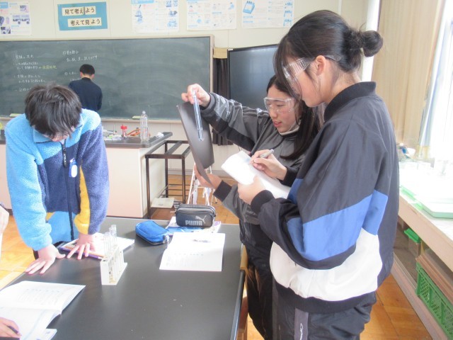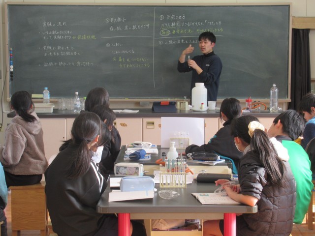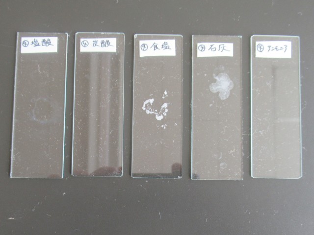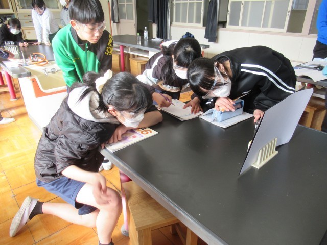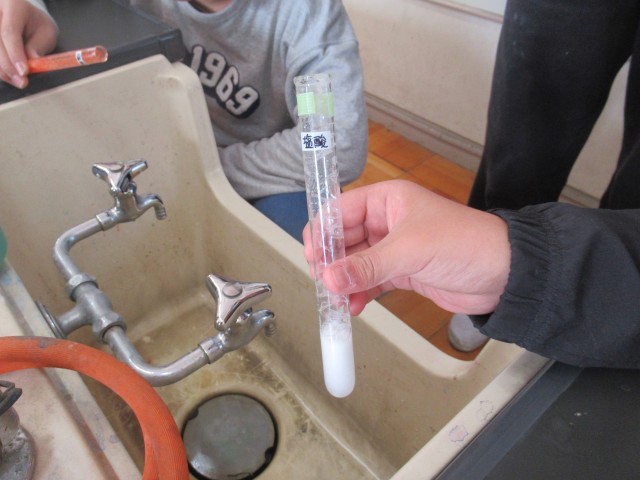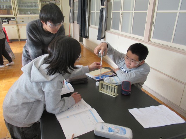 6年生の理科では、「5種類の水溶液(うすい塩酸、炭酸水、食塩水、石灰水、うすいアンモニア水)について、見た様子やにおい、水を蒸発させたとき、二酸化炭素をふれさせたときのちがいを調べよう」というテーマで実験を行いました。この学級では、さらに「チョークを入れたときの様子」についても調べ、理解を深めました。5種類の水溶液は、見た様子はいずれも無色透明で、見た目だけでは区別することができません。しかし、においを確かめたり、水を蒸発させたり、二酸化炭素やチョークを加えたりする実験を通して、それぞれの水溶液がもつ性質の違いをはっきりと捉えることができました。子どもたちは、安全で正確な結果を得るために、事前に説明された実験の約束や操作をしっかり意識しながら、意欲的に実験に取り組んでいました。