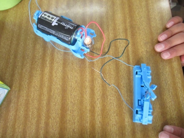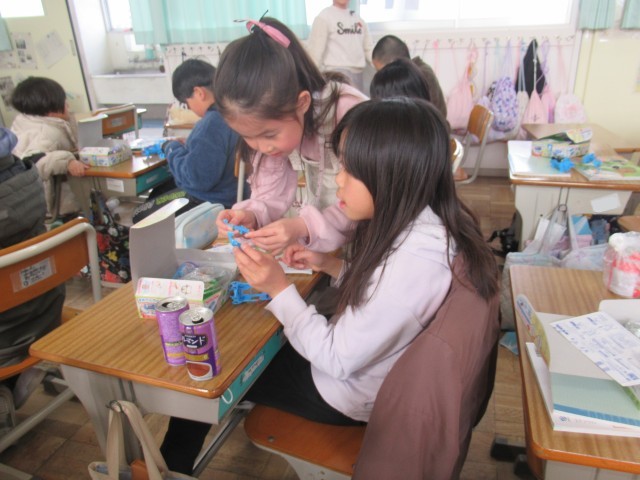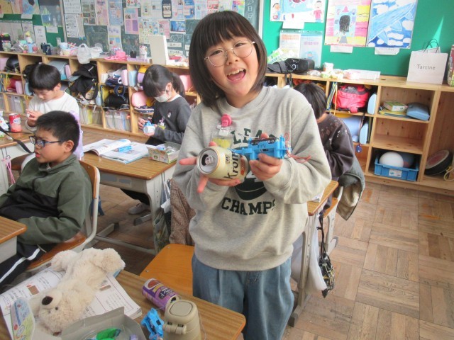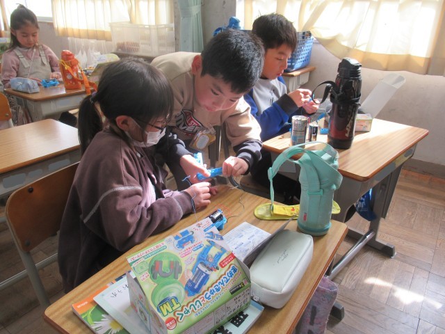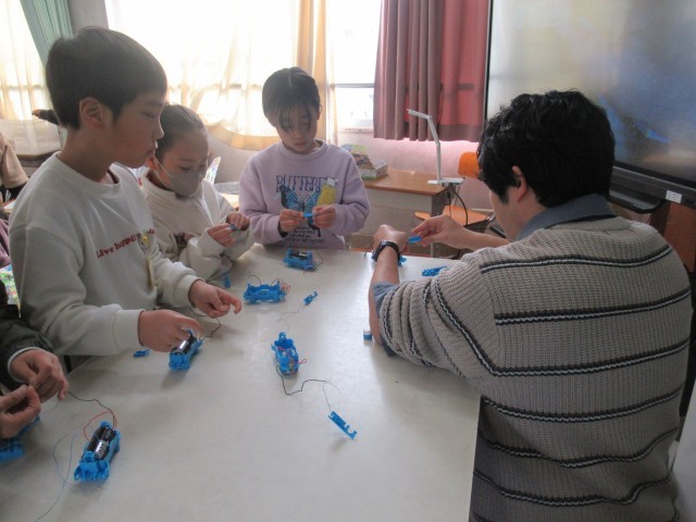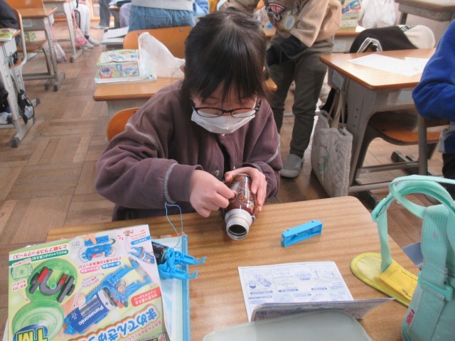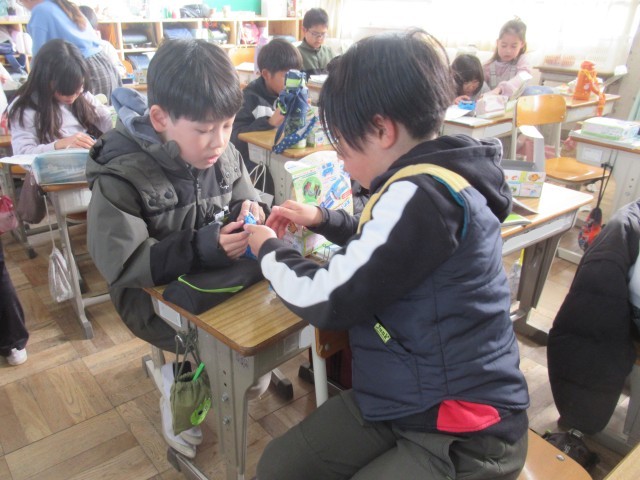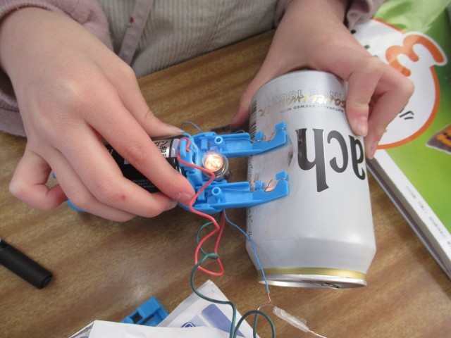 3年生の理科は、「電気を通すもの・通さないもの」について学習しています。今日は、学習キット(写真2枚目)を使って2つのチャレンジに取り組みました。はじめに、「スイッチを作ってみよう」に挑戦しました。(写真3~7枚目)先生から装置の組み立て方について説明を聞いた後、それぞれがスイッチ作りに取り組みました。細かいパーツを扱うため、一人で完成させることができた児童もいれば、友達と協力しながら完成に至った児童もおり、学び合う姿が見られました。次に、「かんの表面をけずって電気を通すか調べよう」に取り組みました。(写真8~10枚目)缶に直接導線をつないでも豆電球はつかず、電気が流れないことを確認しましたが、紙やすりで金属光沢が見えるまで缶の表面を磨き、再度導線をつなぐと豆電球がつき、電気が流れる様子を観察することができました。この実験を通して、電気を流すためには、金属表面の塗装やフィルムを取り除く必要があることを学ぶことができました。