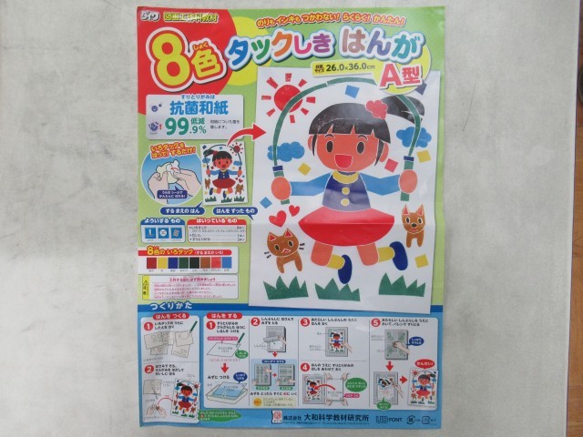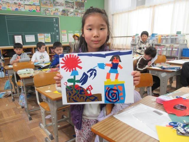 2年生の図画工作では、「カラータック版画」に取り組んでいます。版画というと、木の板を彫刻刀で彫って凹凸を作り、凸面にインキをのせて紙に写す「木版画」を思い浮かべる人も多いと思います。今回は、インキを使わず、吸い取り紙に色を転写できる8色のカラータックを台紙に貼って仕上げる「紙版画」に挑戦しています。版画の特徴である「写したときに左右が逆になる」ことを意識しながら、下絵をもとにカラータックを切ったり貼ったりして、丁寧に下地を作りました。色とりどりで、にぎやかな作品に仕上がりそうで、完成がとても楽しみです。