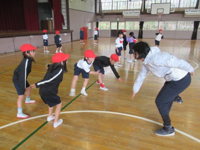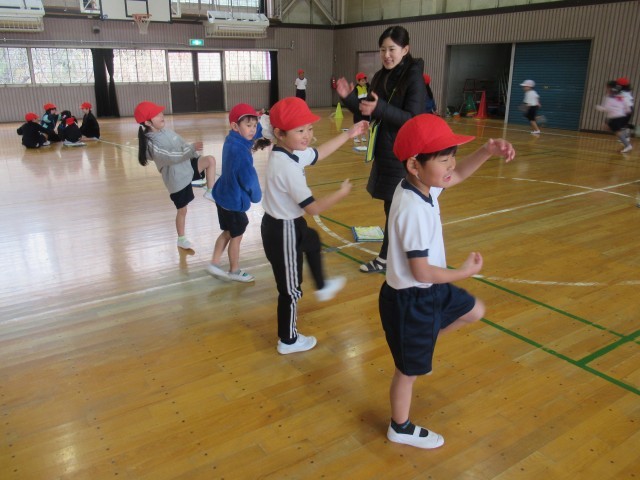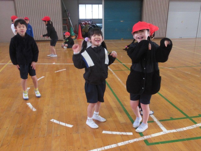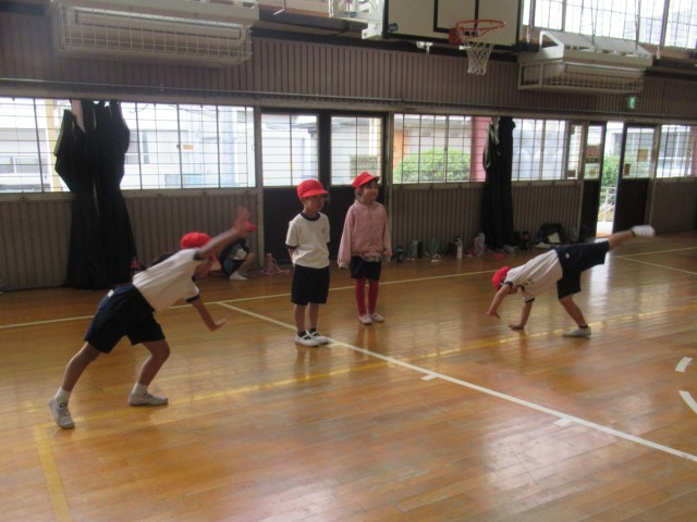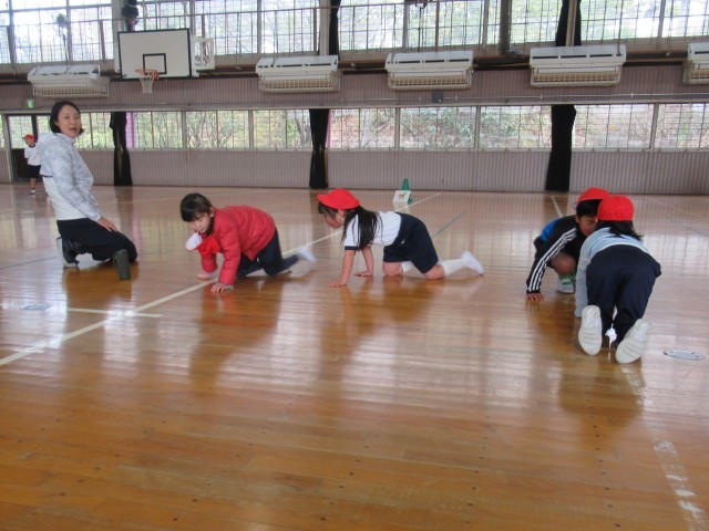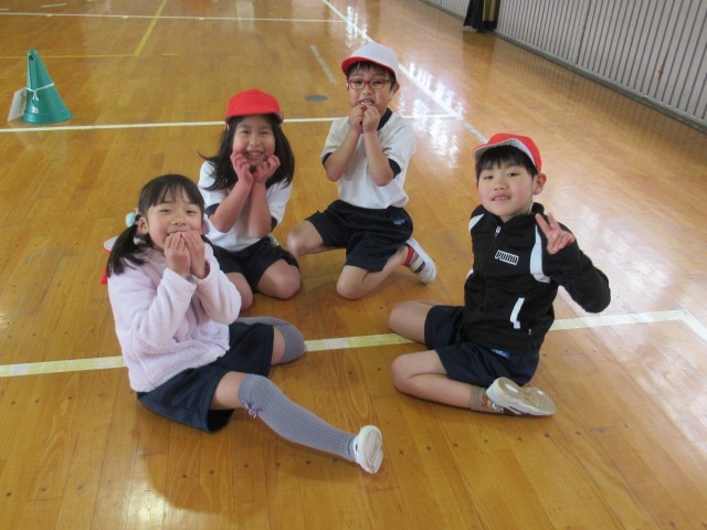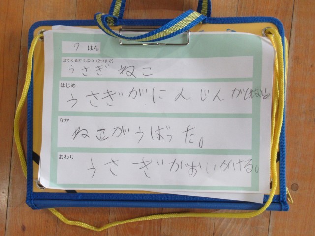 1年生の体育では、「表現あそび」をテーマに、動物になりきって体を動かす表現活動に取り組みました。はじめに、登場させる動物を2つまで決め、「ウサギとネコ」「ゴリラとライオン」など、さまざまな組み合わせを考えました。それぞれのグループは、「はじめ」「なか」「おわり」の展開を意識して物語(写真3枚目)を作り、その物語をもとに、動物の動きや様子を体全体で表現しました。外見や名前は知っていても動き方が分からない動物もありましたが、先生から例を見せてもらったり、アドバイスを受けたりしながら、工夫して動物劇に取り組んでいました。今日も寒い一日でしたが、寒さを忘れて一生懸命活動する1年生の姿がとても微笑ましかったです。
