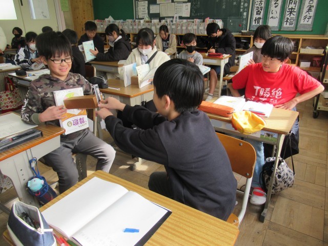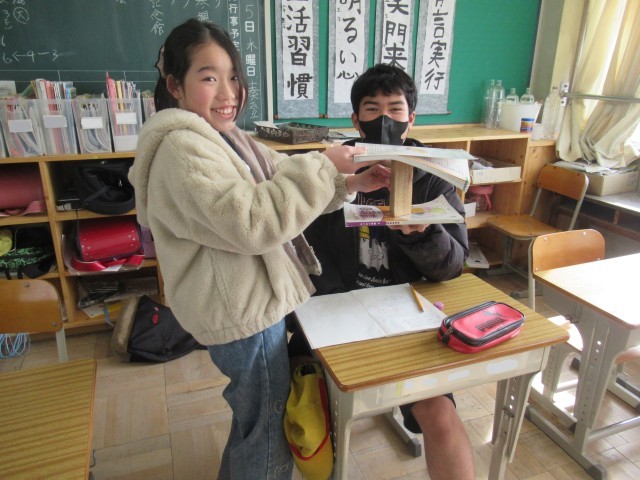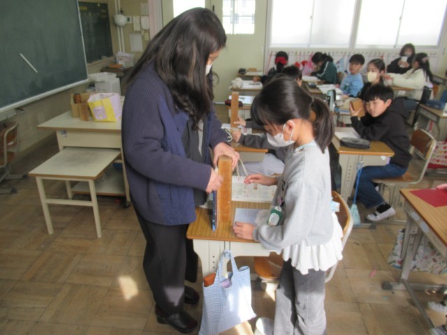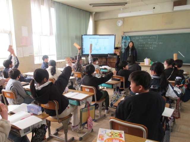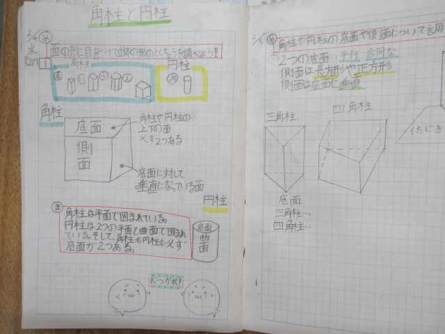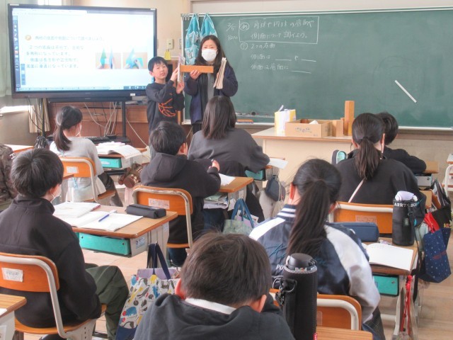 5年生の算数は、「角柱と円柱」について学習しています。昨日の授業は、それぞれの立体の底面や側面の特徴について理解を深めました。本日の授業では、角柱のミニチュア模型を実際に手に取りながら、「2つの底面」や「底面と側面」の関係について調べました。児童たちは、面と面の関係が「平行」であることや「垂直」であることを、模型に教科書を当てながら確認しました。タブレットや電子黒板などの二次元の画面では理解が難しい内容でも、実物に触れることでイメージがしやすくなり、楽しみながら課題を解決する姿が見られました。今回の学習を通して、デジタル機器だけでなく、実物を活用したアナログな学習の大切さも改めて感じることができました。