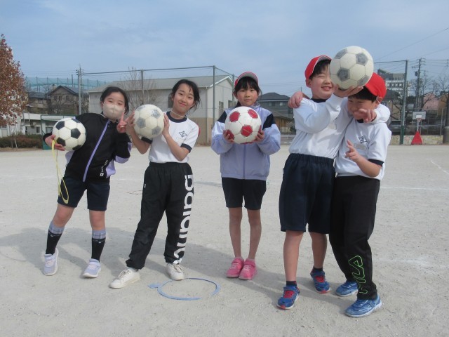 4年生の体育は、「ゴール型ゲーム」に取り組んでいます。今日は、サッカーボールを使い、三人一組でのゲームを行いました。三人のうち二人が攻撃側、一人が守備側となり、的である輪の中にボールを入れることで得点となるルールです。攻撃の途中でボールを奪われたり、ボールがプレイエリアの外に出たりした場合は、攻撃側と守備側が交代します。攻守が次々に入れ替わる中で、得点を目指してドリブルやパスでゴールに迫る攻撃側と、それを阻止しようとする守備側との間で、激しいボールの奪い合いが展開されました。決して広いとはいえないプレイエリアでしたが、子どもたちは夢中でボールを追い続け、自然と運動量も増えていきました。活動後には、心地よい疲労感とともに、達成感あふれる表情が多く見られました。