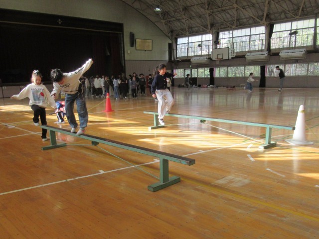 午後、体育館では4年生が2学級合同でレクリエーション活動を行いました。はじめに、学級対抗の障害物リレーに挑戦しました。(写真1~5枚目)同じ学級の仲間がさまざまな障害をクリアするたびに歓声が上がり、体育館の外にまで声が漏れるほど、大きな声援が響きわたっていました。後半はドッジボールを行い、児童は「本気コース」と「お楽しみコース」から自分に合ったコースを選んで参加しました。(写真6~10枚目)それぞれのレベルでゲームを楽しみ、今週最後の時間を思いきり満喫することができました。