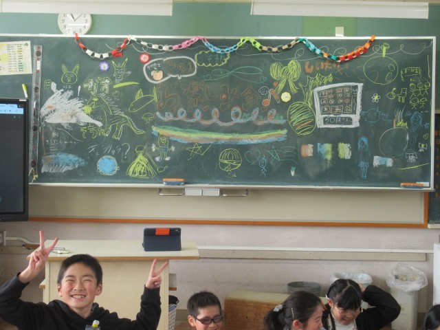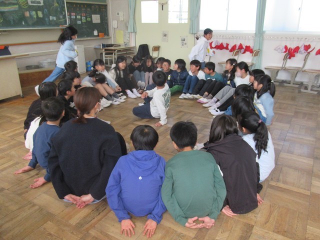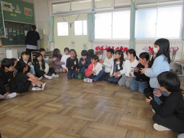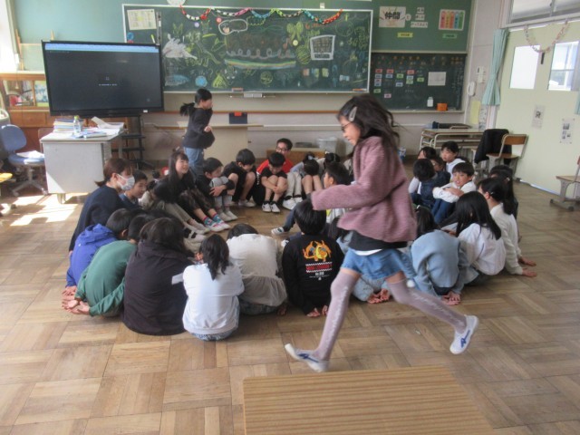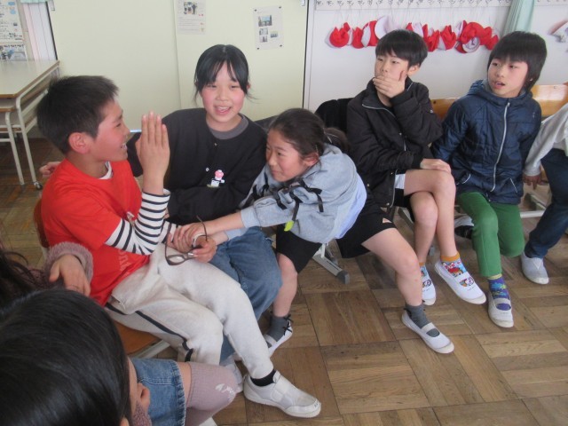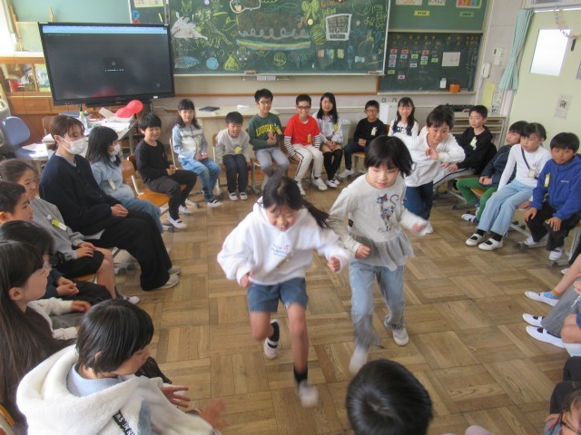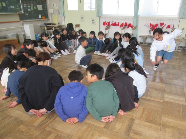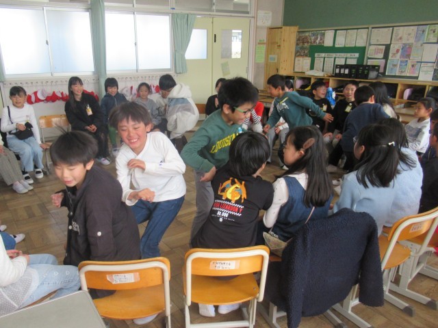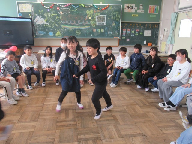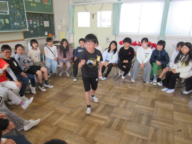 3年生の学級活動では、「お楽しみ会」が行われました。学級委員が進行役を務め、「爆弾回しゲーム」「ハンカチ落とし」「フルーツバスケット」「イス取りゲーム」に取り組み、教室は開始から大きな笑い声と歓声に包まれました。「フルーツバスケット」では、「白い服を着ている人」や「ココア揚げパンが好きな人」といった、服装や好みに関するお題が次々と出されるたびに、当てはまる児童が勢いよく立ち上がり、空いている席を夢中で探して大盛り上がりとなりました。(写真1、7~10枚目)さらに、「先生によく怒られる人」といった思わず笑ってしまうユニークなお題も登場し、4人ほどが立ち上がると、教室中に笑いが広がりました。終始にぎやかで活気あふれる時間となり、友達との仲を一層深める、思い出に残る「お楽しみ会」となりました。
