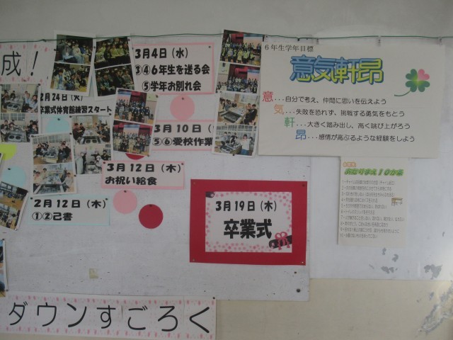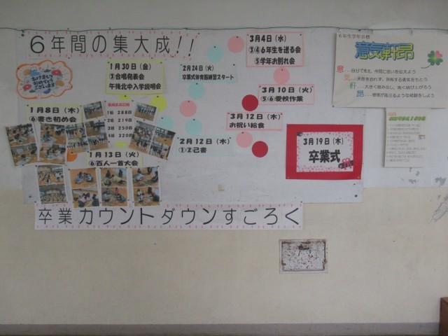 いよいよ明日、卒業式を迎えます。校内では、卒業を目前に控えた6年生を祝う温かな雰囲気が広がっています。各学年のフロアには、6年生の卒業をお祝いする掲示物が数多く飾られ、学校全体で門出を応援する気持ちが感じられます。先月から6年生のフロアには、この3学期の出来事を振り返る掲示物(写真1、2枚目)が掲示され、卒業式までの日々をカウントダウンする内容となっています。3月に入ると、各学年のフロアでもお祝いの掲示(写真3~8枚目)が次第に増え、今日の午後には6年生のフロアに新たな掲示物(写真9枚目)が完成し、その時が近づいていることを実感させてくれます。この1か月間、子どもたちは3月4日の「6年生を送る会」に向けた準備や練習に励み、また、5・6年生は卒業式の練習にも真剣に取り組んできました。学校全体が一丸となり、「6年生の卒業」という大きな節目に向けて努力を重ねてきました。明日はいよいよ卒業式です。校内にあふれる数々の掲示物が、6年生の門出を彩る素敵な演出となることを願っています。