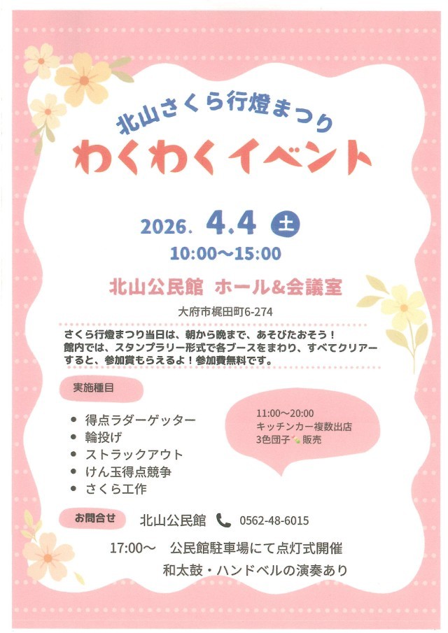 明日4月4日(土)、北山公民館において『北山さくら行燈(あんどん)まつり(写真①)』が開催されます。天候が心配されますが、雨天時には室内にて行燈が展示される予定です。今回の行燈に使用される壁紙は、2月に北山小学校の児童49名が作画した作品です。子どもたちの思いが込められた色とりどりの行燈を、ぜひご覧ください。また、まつり当日は、10時から15時まで「わくわくイベント(写真②)」が初めて開催され、5種類の体験ブースが用意されています。今年度最初の北山公民館でのイベントとなります。ぜひ多くの皆様のご参加をお待ちしております。