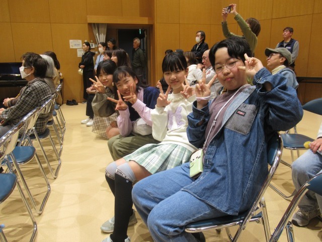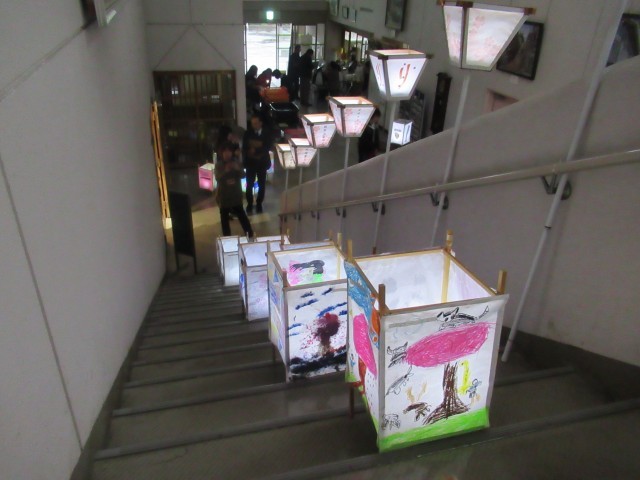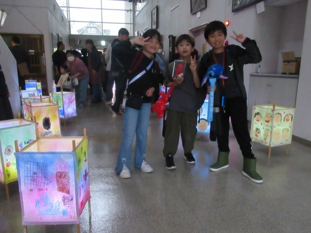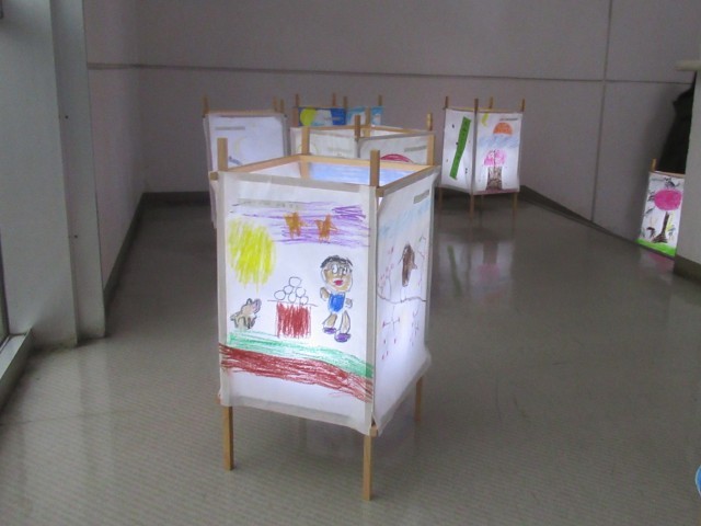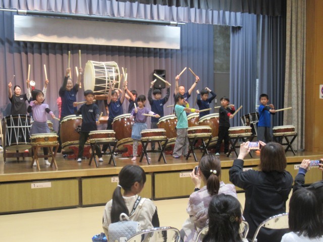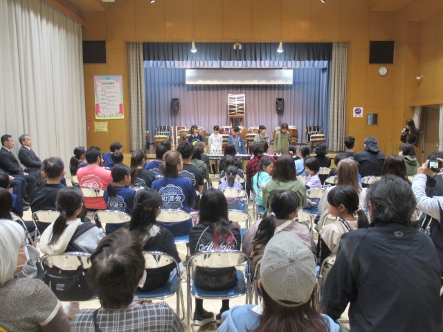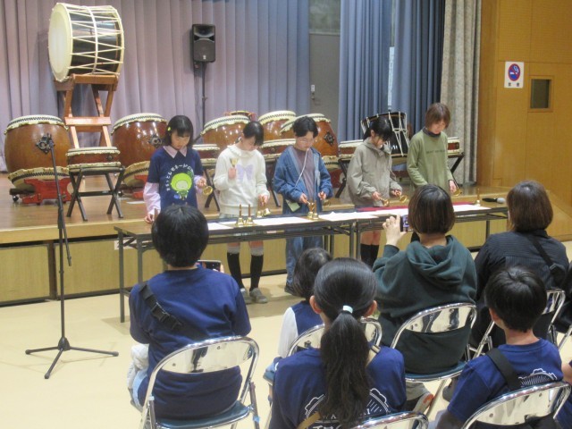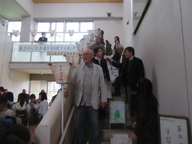 「わくわくイベント」終了後の午後5時より、行燈(あんどん)の点灯式が行われました。はじめに、開会式の前座として北山小学校6年生によるハンドベルの演奏(写真②、③)が披露され、澄んだ美しい音色が会場いっぱいに響き渡り、来場者の心を和ませるとともに、会場の雰囲気を一層盛り上げました。その後、来賓の方々からご挨拶をいただき、いよいよ行燈の点灯が行われました。(写真④~⑦)北山小学校の児童や近隣の園児が和紙に描いた行燈に明かりが灯ると、光に照らし出された色とりどりの絵柄が浮かび上がり、あたりは幻想的な空間に包まれました。閉会式では、北山公民館で活動している和太鼓サークルによる迫力ある演奏(写真⑧)が披露されました。この中には北山小学校の児童も参加しており、力強い演奏で会場を魅了しました。新学期を迎える前に、心に残る素敵な春の思い出となるお祭りとなりました。開催にあたりご尽力いただいた関係者の皆様、ありがとうございました。