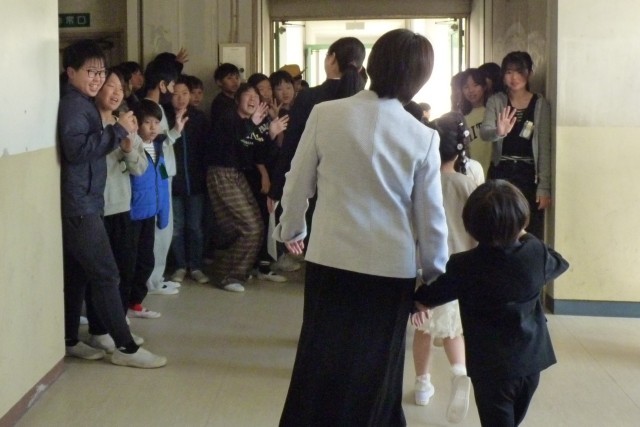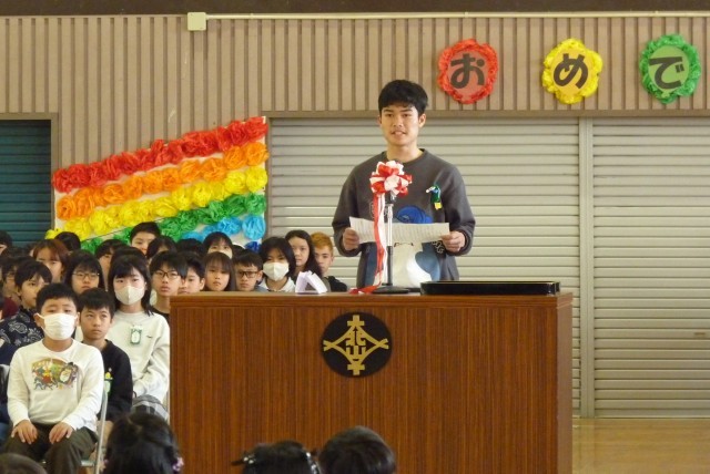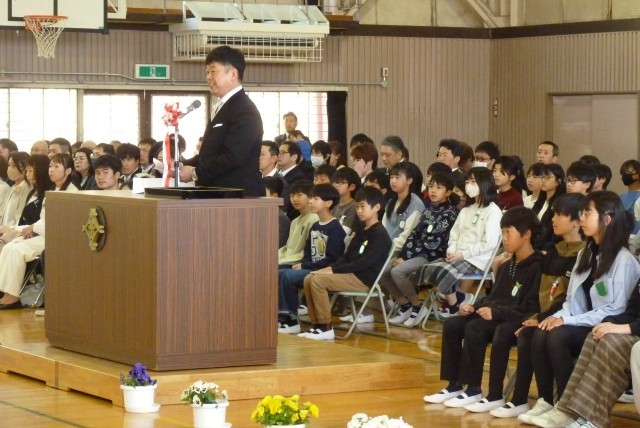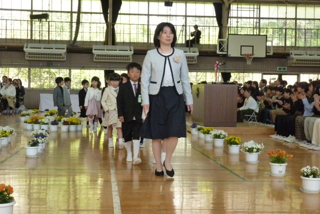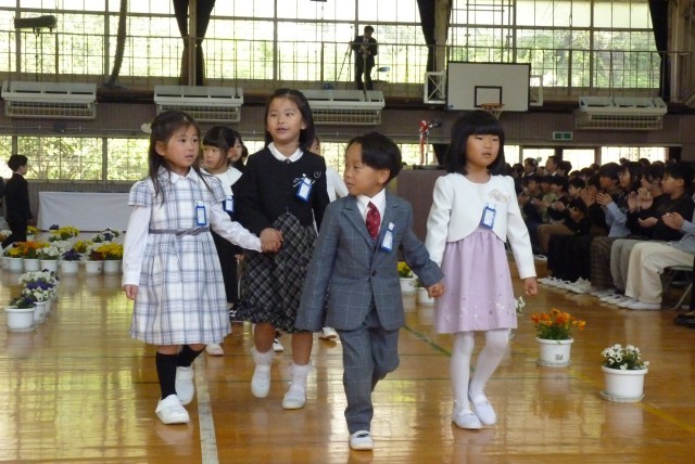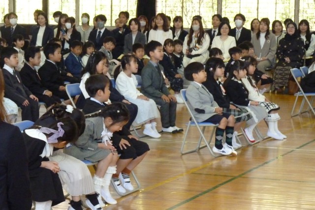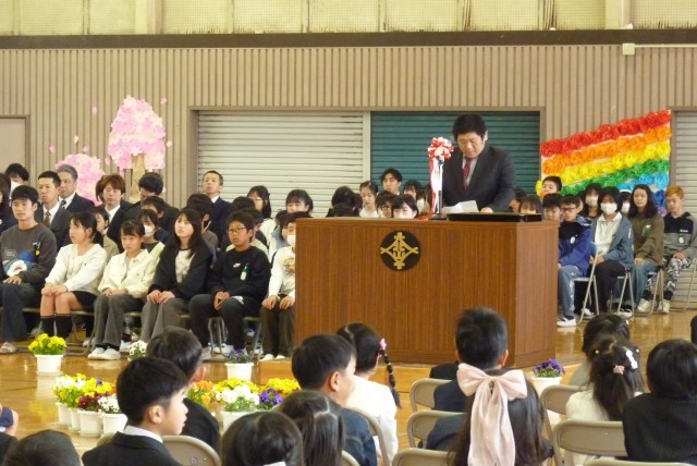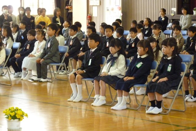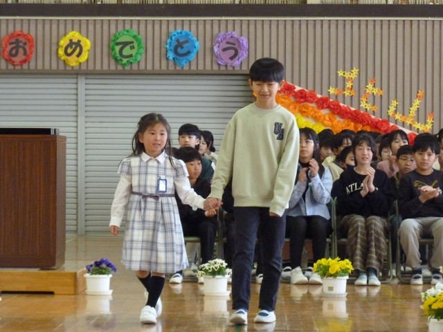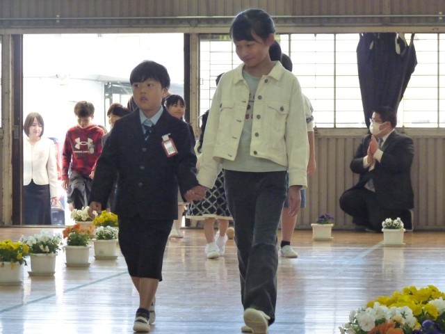 6年生と一緒に入場した新入生は、校長先生や保護者代表のお話(写真⑤、⑥)に真剣に耳を傾けていました。児童代表によるお祝いの言葉(写真⑦)では、これからの小学校生活を共に楽しい時間にしていこうという思いのこもったメッセージが送られ、新入生はその一つ一つの言葉に聞き入っている様子でした。入学式が終わると、張りつめていた緊張もほぐれ、笑顔で体育館を後にする姿が見られました。本日、新入生と共に過ごした6年生は、これから一年間、ペア学年としてさまざまな場面で関わっていきます。両学年にとって、この出会いが今後の活発な交流につながり、心に残る一年となることを期待しています。