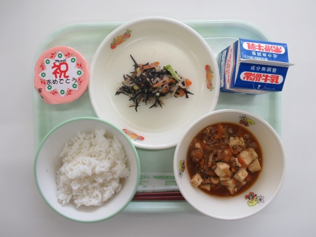 4/13(月) 給食 公開日 2026/04/13 更新日 2026/04/13 給食 今日の給食はごはん 牛乳麻婆豆腐ひじきと春雨の中華あえお祝いデザート エネルギー 653kcal たんぱく質 25.7gです 給食