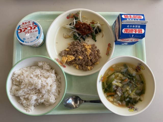 4/27(月) 給食 公開日 2026/04/27 更新日 2026/04/27 給食 今日の給食は麦ごはん 牛乳ビビンバ(肉卵そぼろ、野菜ナムル、たれ)トックスープヨーグルト エネルギー 624kcal たんぱく質 28.3gです 給食