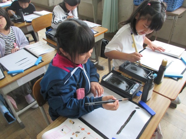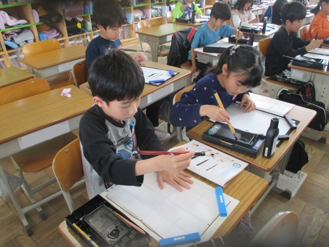 3年生が、初めての習字に取り組みました。はじめに、習字道具の用意の仕方や片付けの仕方を確認しました。筆やすずりの使い方などを一つ一つ確かめながら、準備を進めました。その後、基本となる横の線の書き方を練習しました。子どもたちは、筆の動かし方や力の入れ方に気を付けながら、線の太さを意識して丁寧に書いていました。初めての習字に、真剣に取り組む姿がとても印象的でした。これからの学習が楽しみです。