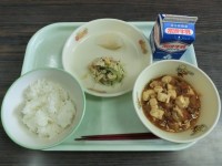今日の給食はご飯 牛乳麻婆豆腐バンバンジーサラダ新高梨 エネルギー 599kca...