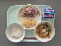 今日の給食は五穀ごはん 牛乳三河赤鶏のチキンカツ千草和え呉汁鬼まんじゅう エネル...