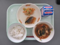 今日の給食はご飯 牛乳さんまの銀紙焼き青菜のアーモンド和えけんちん汁 エネルギー...