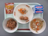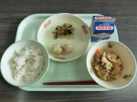 今日の給食はごはん 牛乳けんちん信田の甘味噌かけじゃがいものそぼろ煮白菜の昆布和...