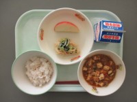 今日の給食は麦ごはん 牛乳大豆ミート入り麻婆豆腐キャベツと春雨の和え物りんご エ...
