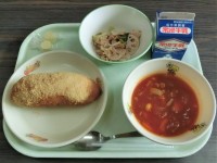 今日の給食は麦ごはん 牛乳鮭フライのレモンソースかけ磯香和え(刻み海苔)のっぺい...