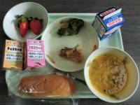 今日の給食は小型ロールパン 牛乳鶏肉のハーブ焼きブロッコリーサラダデザートセレク...