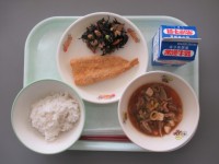 今日の給食はご飯 牛乳にぎすフライひじきの炒め煮豚汁 エネルギー 625kcal...