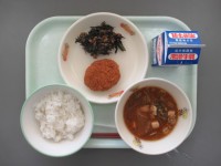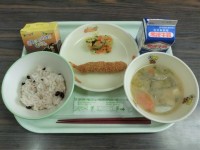 今日の給食はごはん 牛乳キャベツ入りメンチカツひじきの炒め煮豚汁 エネルギー 6...