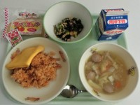 今日の給食はチキンライス 牛乳オムライス (薄焼き卵) (小袋ケチャップ)春野菜...