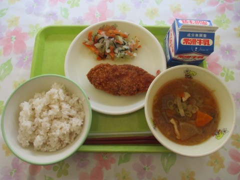 9月26日 給食 公開日 2025/09/26 更新日 2025/09/26 給食 今日の給食は、麦ご飯、牛乳、鮭フライのレモンソースかけ、紫蘇ひじき和え、さつまいもの味噌汁エネルギー632キロカロリー、たんぱく質26.5グラムです 給食