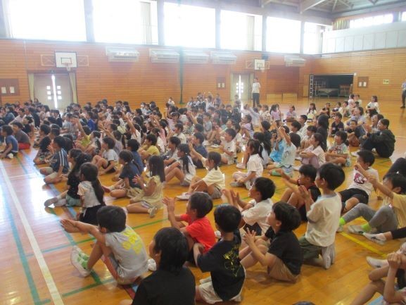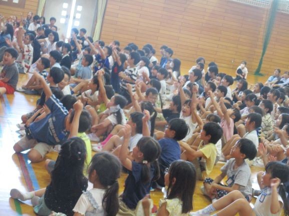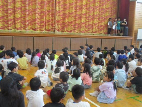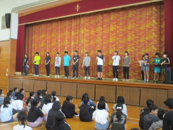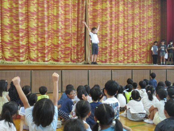 前期総務委員の最後の企画、「先生だれでしょう大会」が大放課に行われました。今日は1・2・6年生とたけのこ学級の先生が登場です。自己紹介をしたあと、幕の後ろで隠れ声まねをし、だれが声まねをしているのか当てるゲームです。声まねを聞いていると芸達者な先生がいることが分かりました。でも、普段からよく聞いている先生の声だからでしょうか、子どもたちはちゃんと正解をしていました。さすがです。