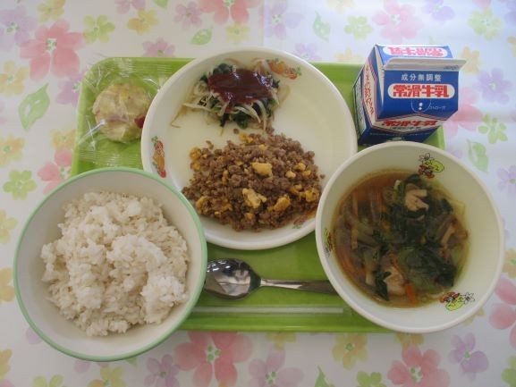 10月23日 給食 公開日 2025/10/23 更新日 2025/10/23 給食 今日の給食は、麦ご飯、牛乳、ビビンバ(肉卵そぼろ・野菜ナムル・たれ)、ワンタンスープ、鬼まんじゅう※郷土料理エネルギー669キロカロリー、たんぱく質27.6グラムです 給食