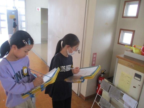 10月24日 学校の防火設備(3年2組) 公開日 2025/10/24 更新日 2025/10/24 3年 校内の防火設備は、どこにどんなものがあるのか調べています。校内の白地図に見つけたものを印で表しています。「ここにこれがあるってことは、きっと1回の同じところにもあるんじゃない」と予想しながら回っていました。見つけたものを発表していくと、どんな気付きが出るのでしょうか。 +3 3年生