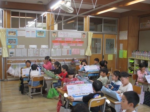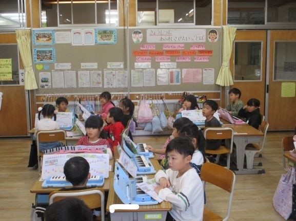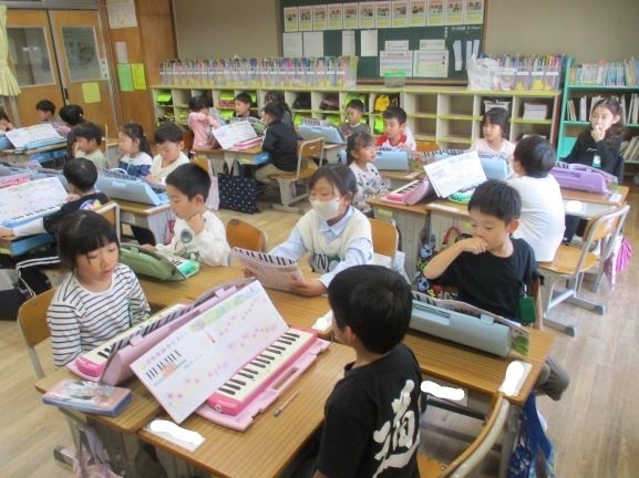 10月27日 かっこう(1年3組) 公開日 2025/10/27 更新日 2025/10/27 1年 鍵盤ハーモニカで「かっこう」を演奏します。この「かっこう」は3拍子の曲であり、3拍子の曲を演奏するのはこの曲が初めてです。3拍子の拍の流れを感じるために、階名唱をしたり、指使いの数字で歌ったりしました。三拍目の休符を意識しながら行っていました。 +1 1年生