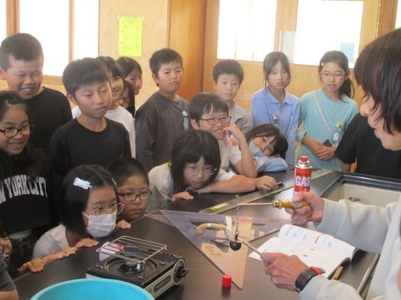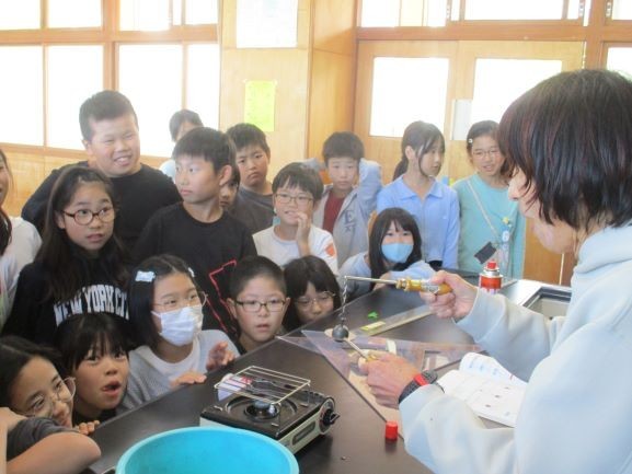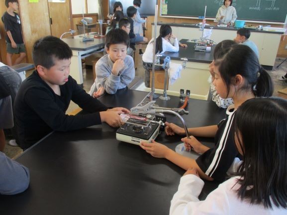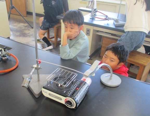 空気、水と温めたときと冷やしたときの体積に変化があるのか実験をしてきました。今日は金属です。金属棒をお湯で温めたり、火で熱したりして体積に変化があるか実験をしました。1、2㎜伸びたという結果が出ました。そして次は金属の球を温めたらどうなるのか、教師による実験をしています。最初は穴を通過していた球が、火で熱すると通らなくなりました。温まっている球を水で冷やした後にもう一度穴に通してみると・・・「通った!」と子どもたちから歓声が上がりました。
