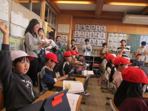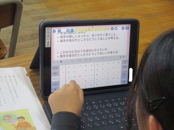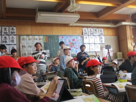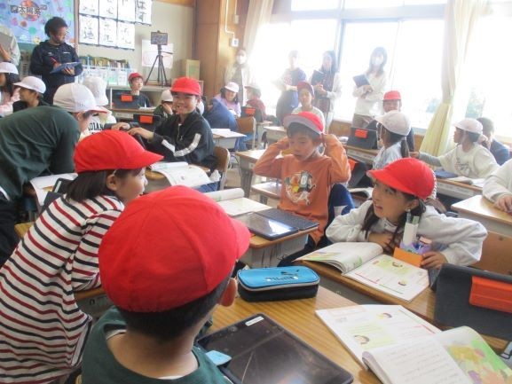 足の悪いおばあさんに声を掛けた、後ろから見守ったという主人公の二つの行動について考えることで、親切とは何かを考えました。赤白帽子で自分の立場を示し、話し合っています。この授業は、教員の授業力向上のための研究授業として行われたので、周りを教員が囲んでいましたが、のびのびと自分の思いを伝えていました。振り返りでは、親切とは相手の状況を考え、相手の思いを大事にすることが大切だと書いている子が多かったです。
