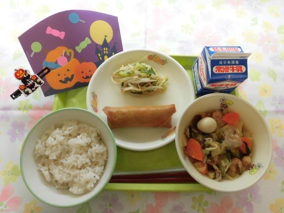 麦ご飯、牛乳、春巻き、八宝菜、もやしの中華和え