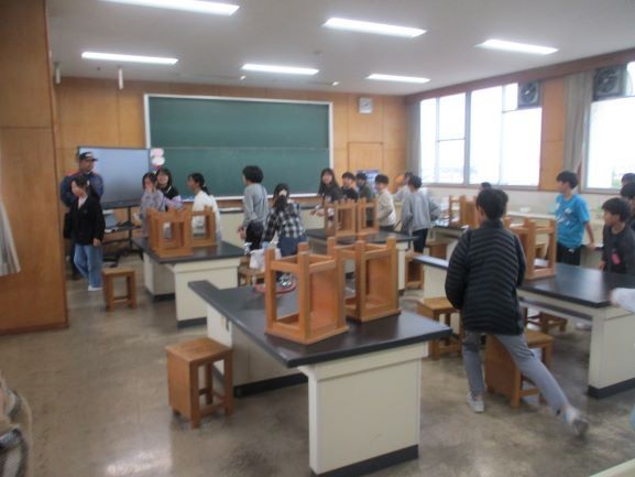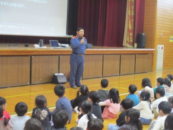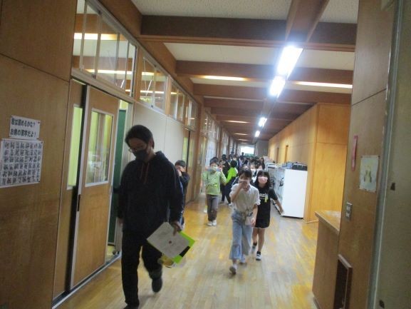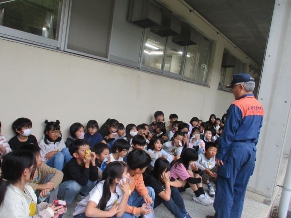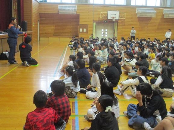 秋になると空気が乾燥し、風の強い日が増えることや暖房器具等を使う機会が増えるので、火災が発生する条件がうまれやすくなります。そこで、火災避難訓練を行いました。理科室から出火という想定で避難をしました。本来ならば運動場に避難するのですが、天候が崩れてきたので体育館に避難しました。避難にかかった時間は約7分で、消防署員の方からは素早く静かに避難できていたと褒めていただきました。