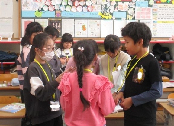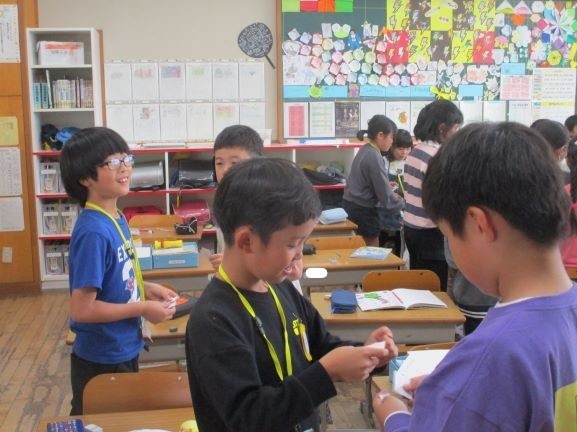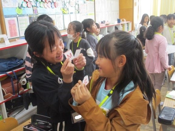 外国語の音声や基本的な表現に慣れ親しませながら、コミュニケーション能力の素地を養う」(学習指導要領目標より)ものです。話すこと、聞くことが多いですが、文字についても触れています。3年生ではアルファベットの大文字を取り扱っています。形と読み方を覚え、今日は自分の名前の頭文字に当たるアルファベットを交換しています。