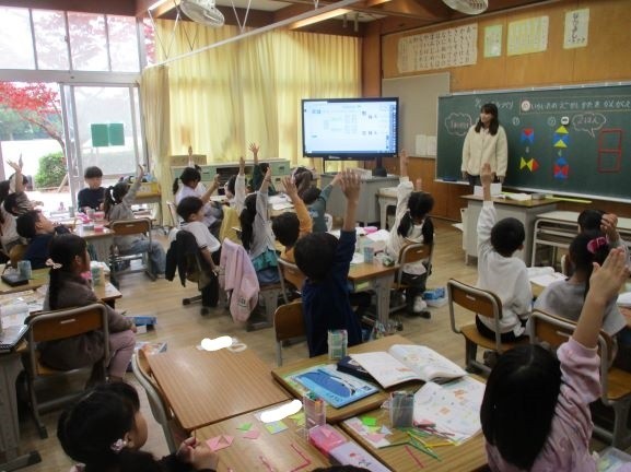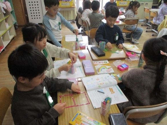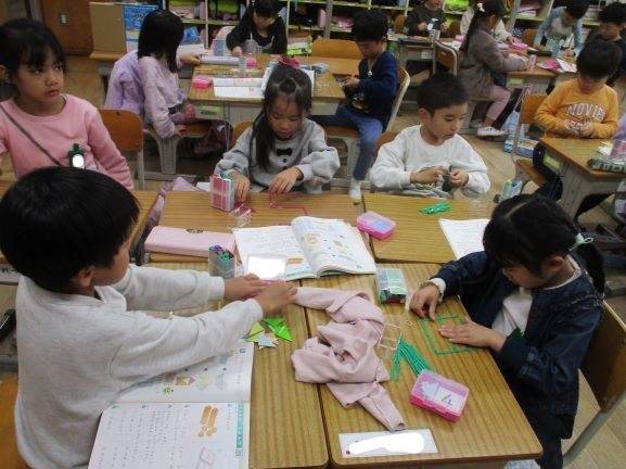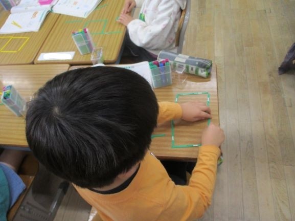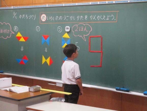 この単元では、色板や棒などを使っていろいろな形を作ってきました。今日はもとの形から数枚(または数本)動かして、形を変える活動をしています。棒で作ったデジタル数字の8から棒を1本動かすとどんな数字になるのか、2本動かすとどんな数字になるのかを考えています。