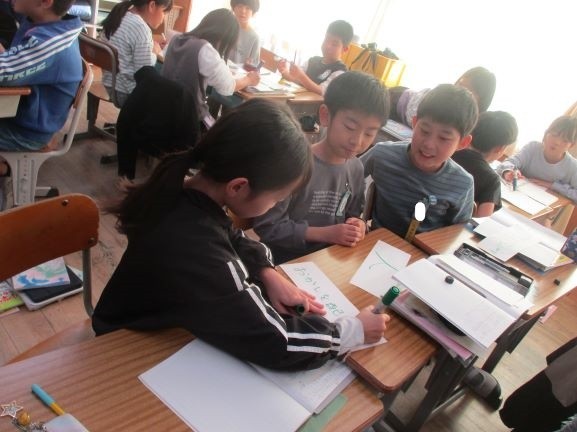 年中行事を続けていくためにはどんなことが必要なのか考えています。自分でまずは考え、それをグループで出し合って3つに絞りました。その後はグループの考えを出し合い、共有しました。「多くの人に知ってもらうために宣伝をするといい」「人をたくさん集めるためにアンケートをするといい」「昔から伝わっている物や道具を大切にする」などの考えがでていました。
