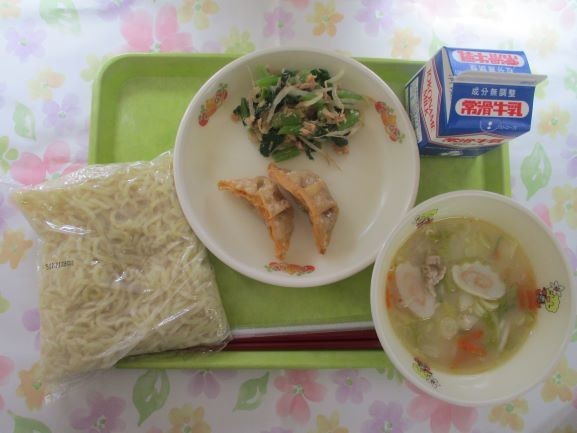 11月11日 給食 公開日 2025/11/11 更新日 2025/11/11 給食 今日の給食は、中華麺、牛乳、豚骨風スープ、揚げ餃子、小松菜の中華和えエネルギー624キロカロリー、たんぱく質26.5グラムです 給食