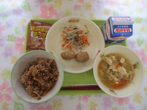 11月12日 給食 公開日 2025/11/12 更新日 2025/11/12 給食 今日の給食は、まぐろと切り干し大根のご飯(アルファ化米)、牛乳、レバー入りつくね、野菜とわかめの和え物、豆腐と湯葉のすまし汁、さつまいもチップスエネルギー581キロカロリー、たんぱく質29.1グラムです 給食