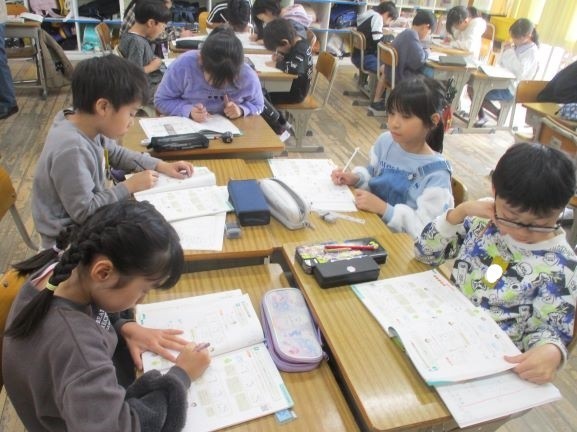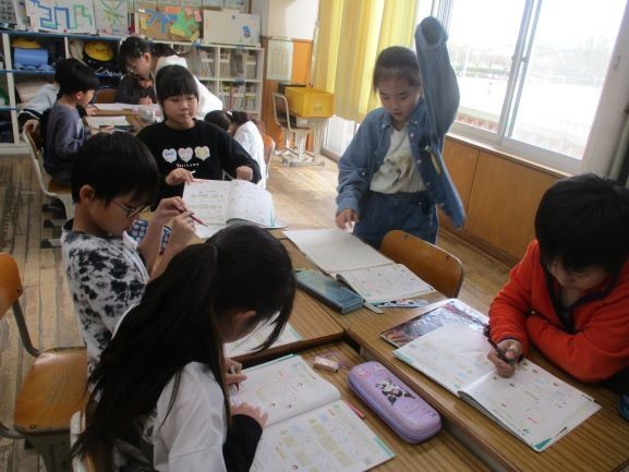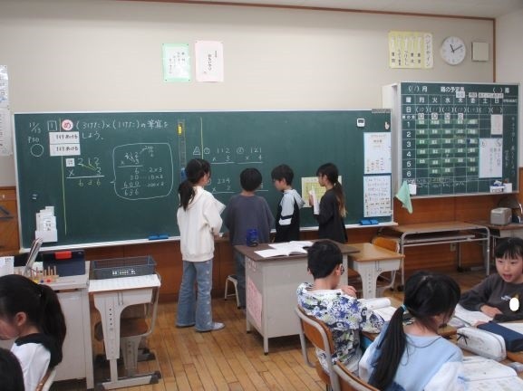 11月13日 1けたをかけるかけ算の筆算(3年1組) 公開日 2025/11/13 更新日 2025/11/13 3年 今までは(2位数)×(1位数)の計算の仕方について学習してきました。今日は(3位数)×(1位数)の計算の仕方です。まずは自分で解いてみました。その後は、グループで答えの確認をし、説明の仕方を一緒に考えました。かけられる数が3桁になっても、今まで通りのやり方で解くことができることに気付きました。 +3 3年生