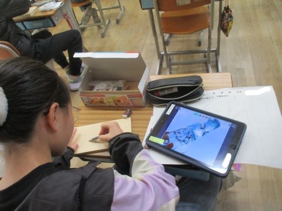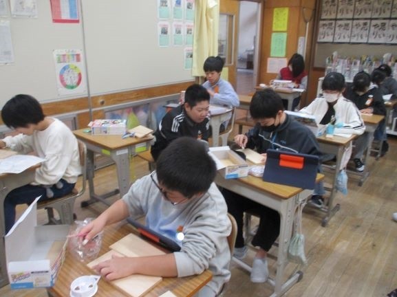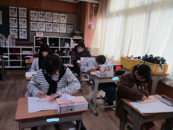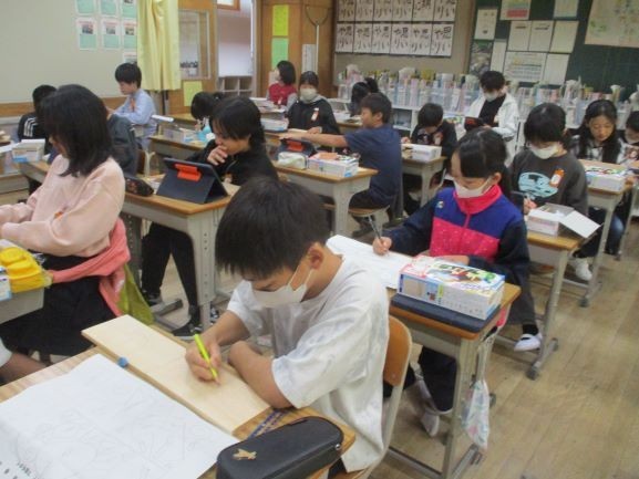 11月13日 テープカッター作り(6年3組) 公開日 2025/11/13 更新日 2025/11/13 6年 前の時間までにテープカッターのデザインを決めました。今日はそのデザイン画を見ながら、板に下絵を描いています。二つの側面で似たデザインにしたり、正反対のイメージにしたりと工夫が見られました。完成が楽しみです。 +2 6年生