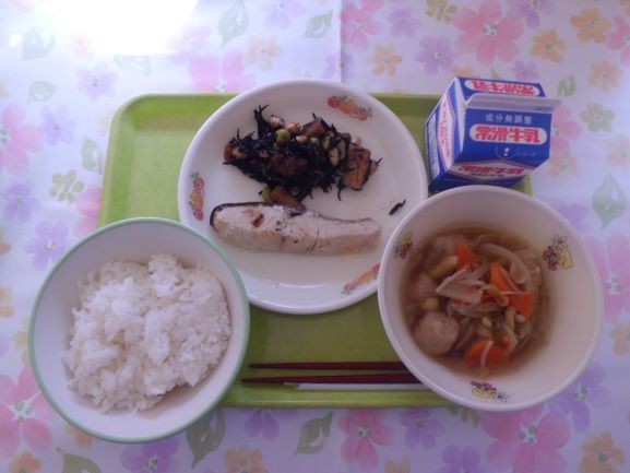 11月17日 給食 公開日 2025/11/17 更新日 2025/11/17 給食 今日の給食は、ご飯、牛乳、酒の塩麹焼き、ひじきと大豆の炒め煮、鶏団子汁エネルギー603キロカロリー、たんぱく質30.3グラムです 給食