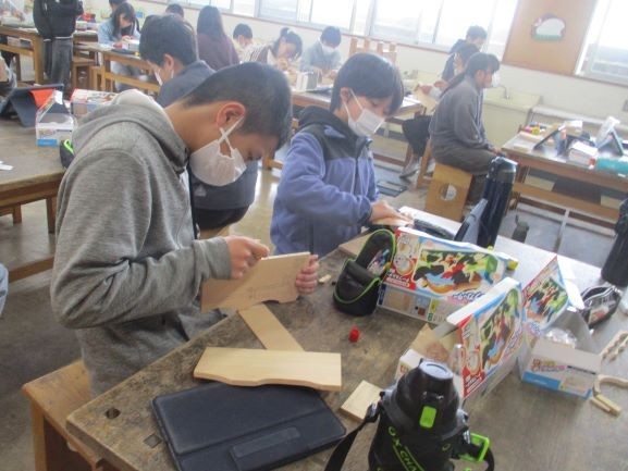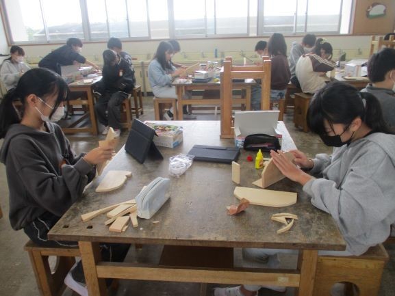 11月18日 テープカッター作り(6年1組) 公開日 2025/11/18 更新日 2025/11/18 6年 下絵に合わせて板を電動のこぎりで切りました。その後は、やすりで磨いて面を整えています。これを丁寧に行っておくと、使いやすいものになりますね。 +2 6年生