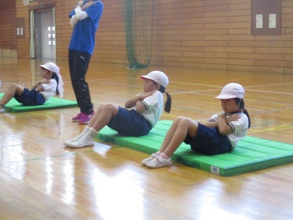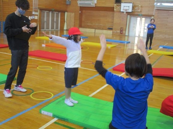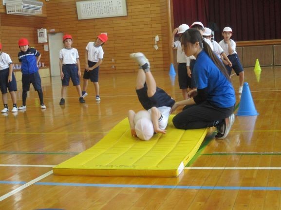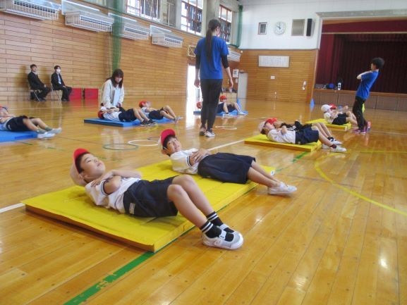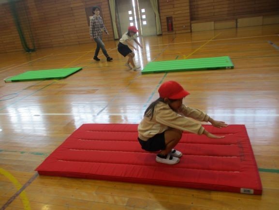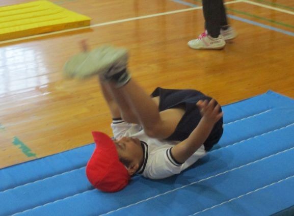 大府はつらつ運動プログラムのマット運動2回目です。今日は、後転にも挑戦しました。まずは、後転に必要となる筋肉を意識したり、動きのポイントを練習したりました。そして、傾斜を付けたマットで後転にチャレンジしました。1枚目のマットは後転で、2枚目・3枚目のマットは前回の前転の復習をしました。前転では両足の裏でしっかり着地して立ち上がることができる子が増えてきました。