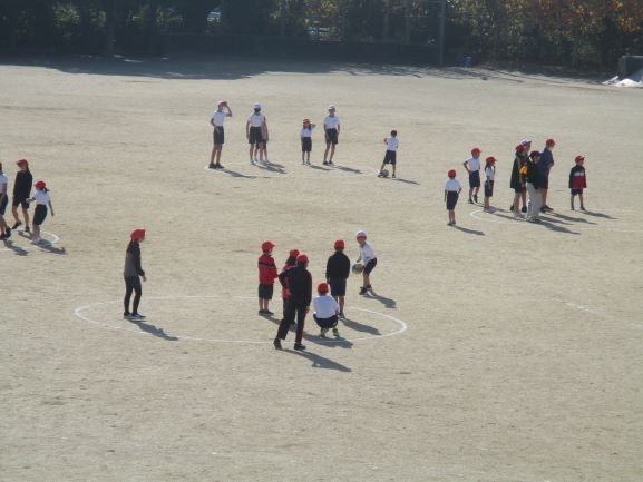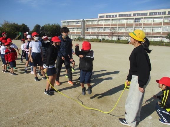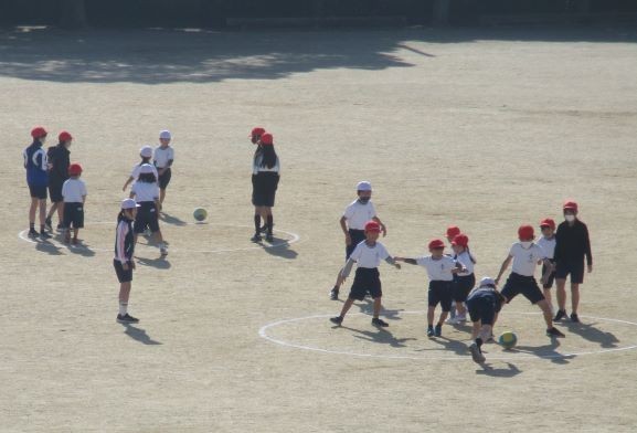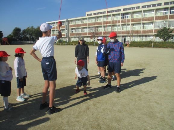 11月27日 8の字跳び(1年2組・6年1組) 公開日 2025/11/27 更新日 2025/11/27 けやきっ子活動 本校では2月になわとび大会として、クラスごとに大縄で8の字跳びに挑戦します。1年生は大縄を跳んだことがない子も多いため、6年生が跳び方を教えてくれました。6年生が跳び方のお手本を見せてくれたり、縄に入るタイミングを教えてくれたりしていました。そのおかげもあって、何人か跳ぶことができるようになりました。なわとびの後は、転がしドッジボールを一緒に楽しみました。 +3
