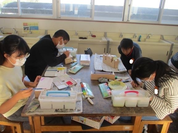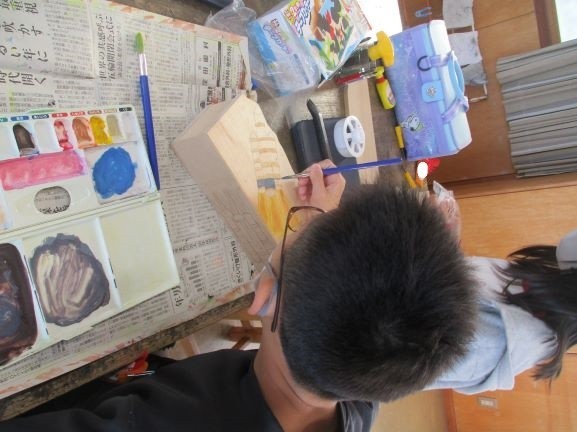 11月27日 テープカッター作り(6年3組) 公開日 2025/11/28 更新日 2025/11/28 6年 電動糸のこぎりで切った板を組み立てていました。接着剤が固まったら、下絵に色づけしていきました。色づけしてから組み立てるのかと思っていたら、逆でした。絵を塗り終わったら、部品を付けて、ニスを塗って完成です。あと少しですね。 +2 6年生
