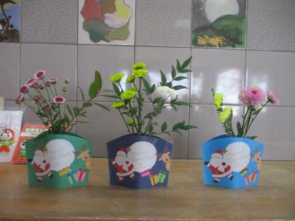 まっちゃーずさんが12月のお花飾りを持ってきてくださいました。プレゼントを入れた袋が破けてしまい慌てているサンタさんと微笑んでいるトナカイさんのデザインです。今回も娘さんが考えてくれたそうです。トナカイの鈴の細部まで丁寧に作り込んであります。毎回、すてきな飾りをありがとうございます。