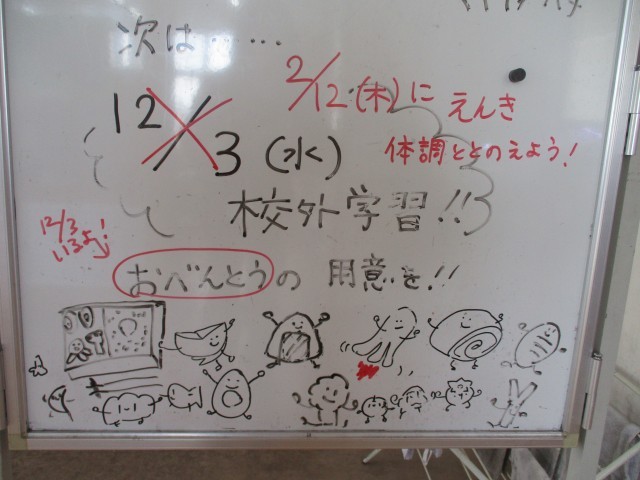 体調不良者が多くなっているため、12月3日に予定していた校外学習を延期いたします。12月3日の給食はカットしているため、予定通りお弁当を持ってきてください。