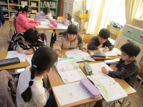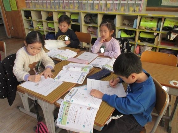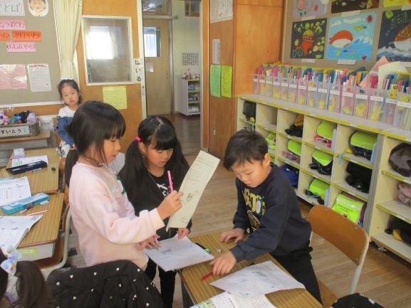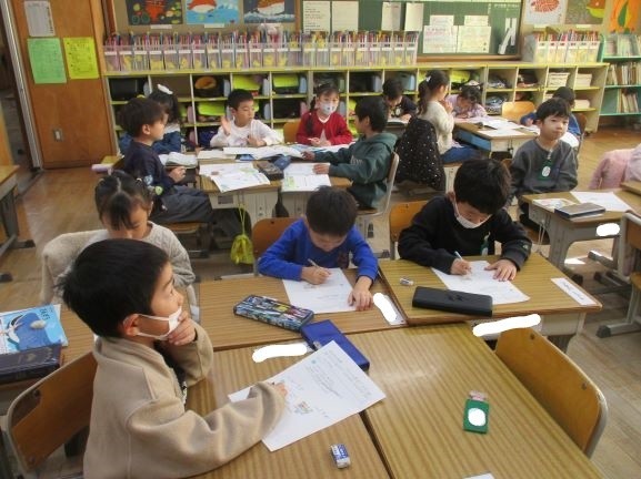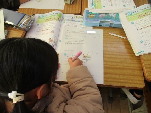 この単元では、絵や図を活用してある数量を他の数量に置き換えて考えたり、並んでいる数からその順番を考えたりします。椅子が5脚並んでいて、その後ろに6人立っている写真を撮影するときに、何人の人が写真に写るのか考える問題では、椅子の数を人の数と置き換えて考えます。椅子のマークと立っている人のマークを描いて考えていました。前から6番目に並んだ女の子の前に何人いるか考える問題でも、○を6個描いて、6個目に女の子の印を付けて前にある丸の数を数えていました。絵や図を描くことで考えが整理される体験をたくさんしていきます。